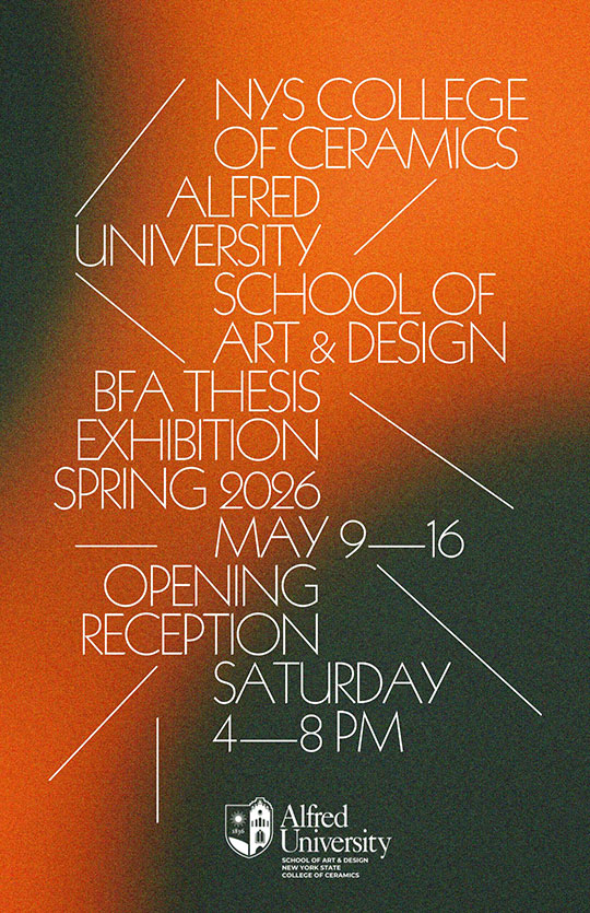 The School of Art & Design at Alfred in the New York State College of Ceramics at University is proud to present the 2026 Bachelor of Fine Arts (BFA) Senior Exhibitions, an event celebrating the creative accomplishments of its graduating students. The exhibition will open with a public reception from 4-8 p.m. on Saturday, May 9, and some exhibitions will remain on view through Sunday, May 17.