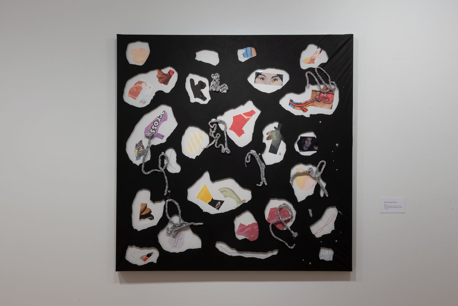 Click to view black poster background with lots of cutout shapes containing pieces of artwork Full-Screen