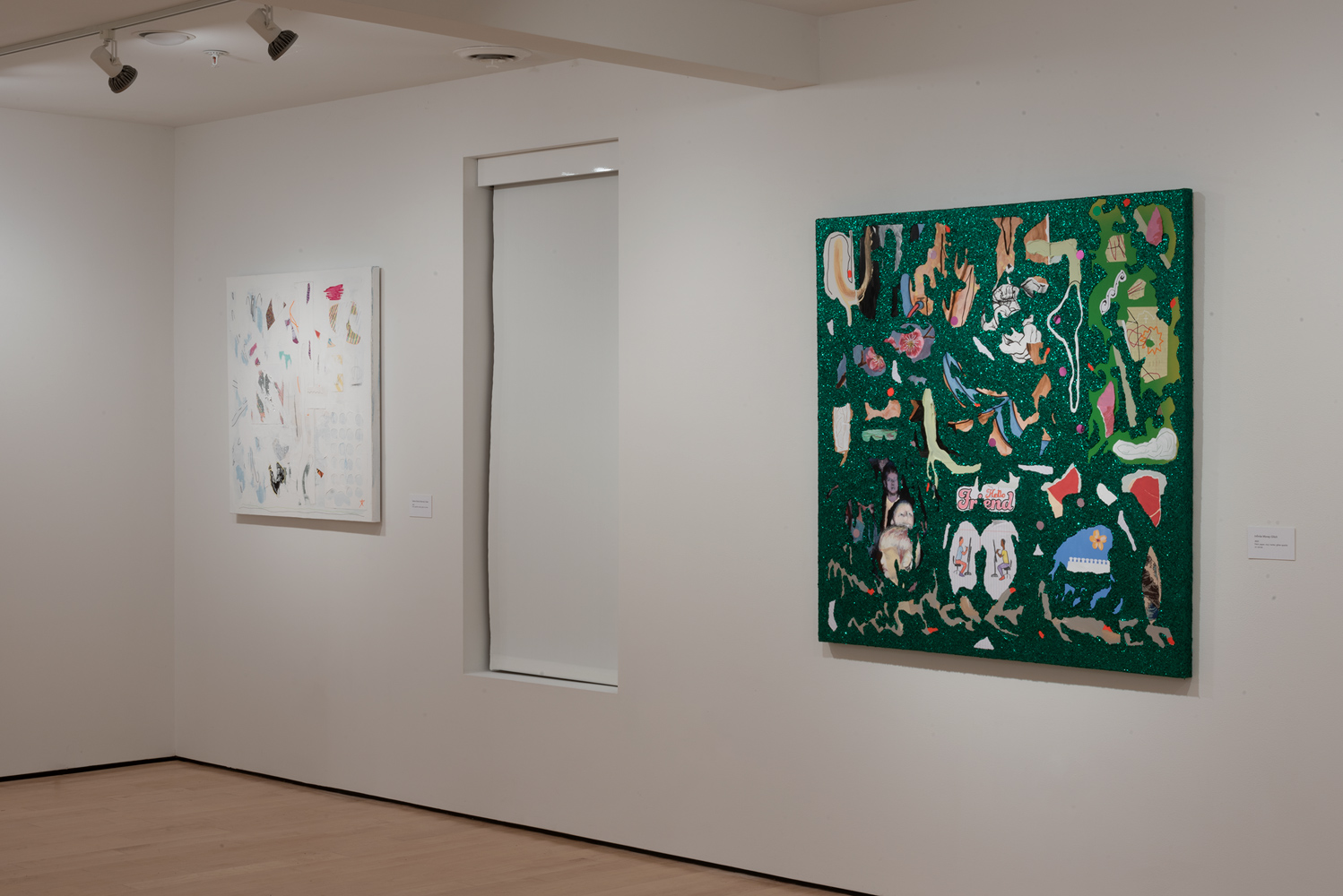 Click to view corner of gallery with artwork and paintings hung on the wall Full-Screen