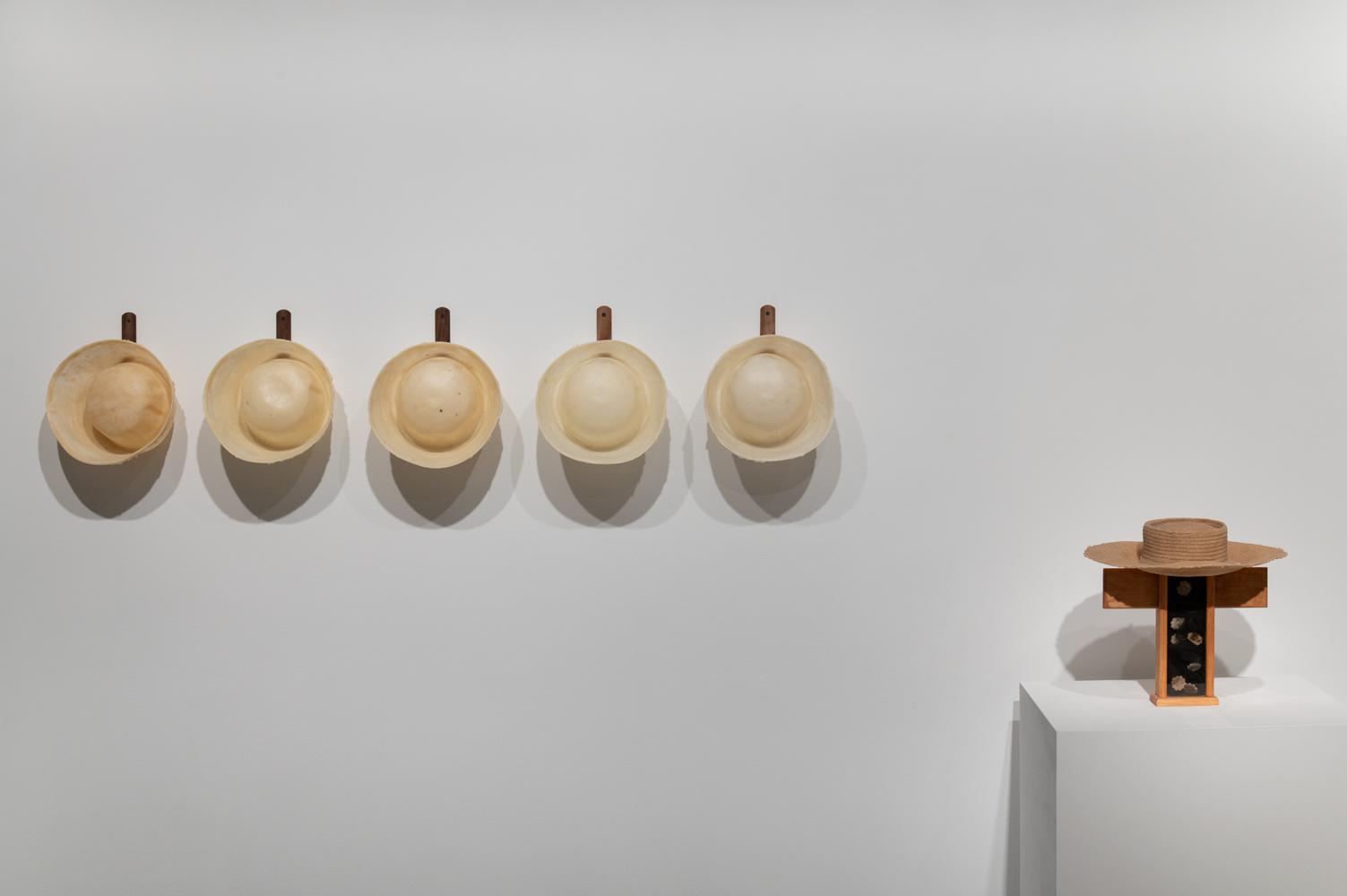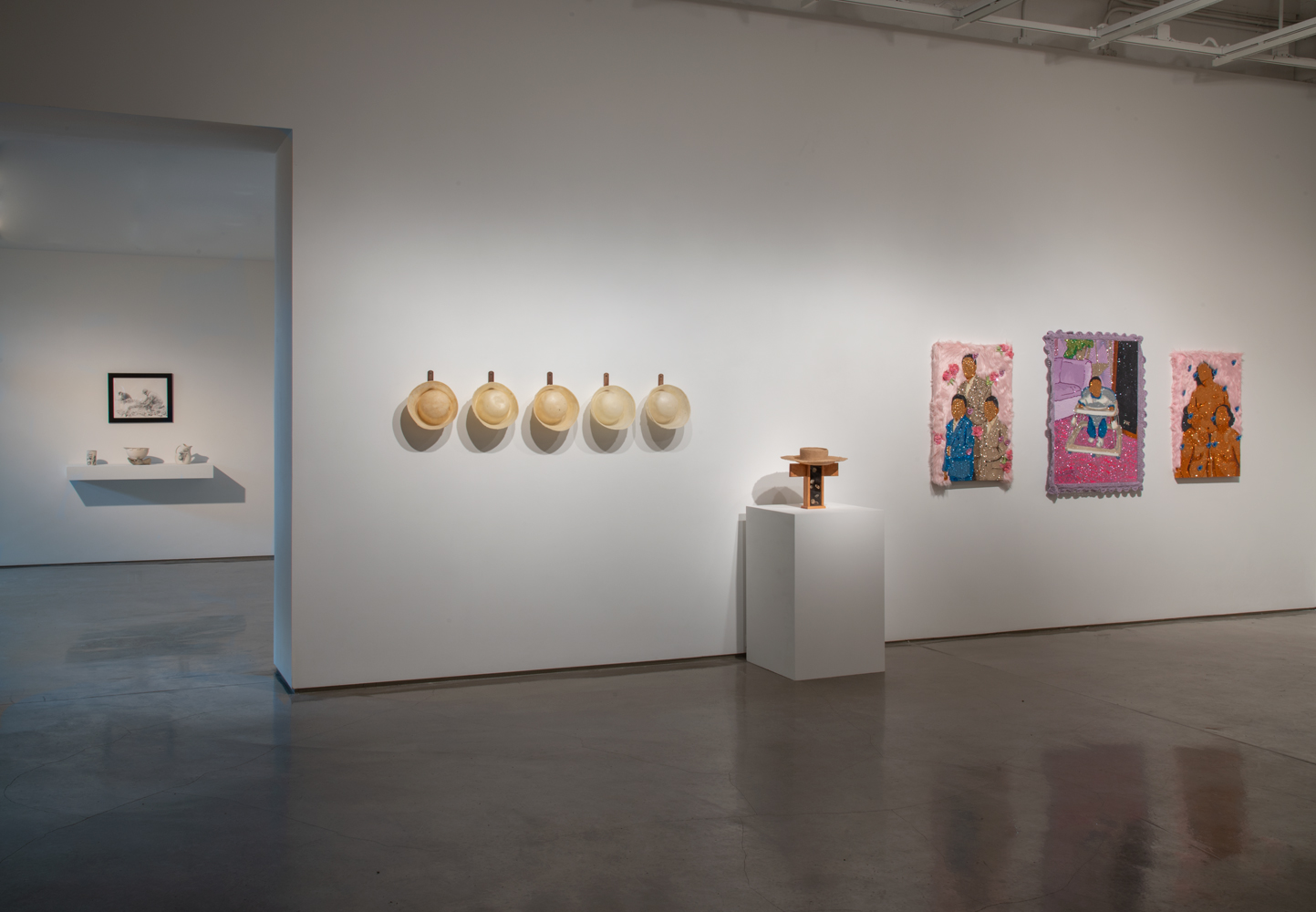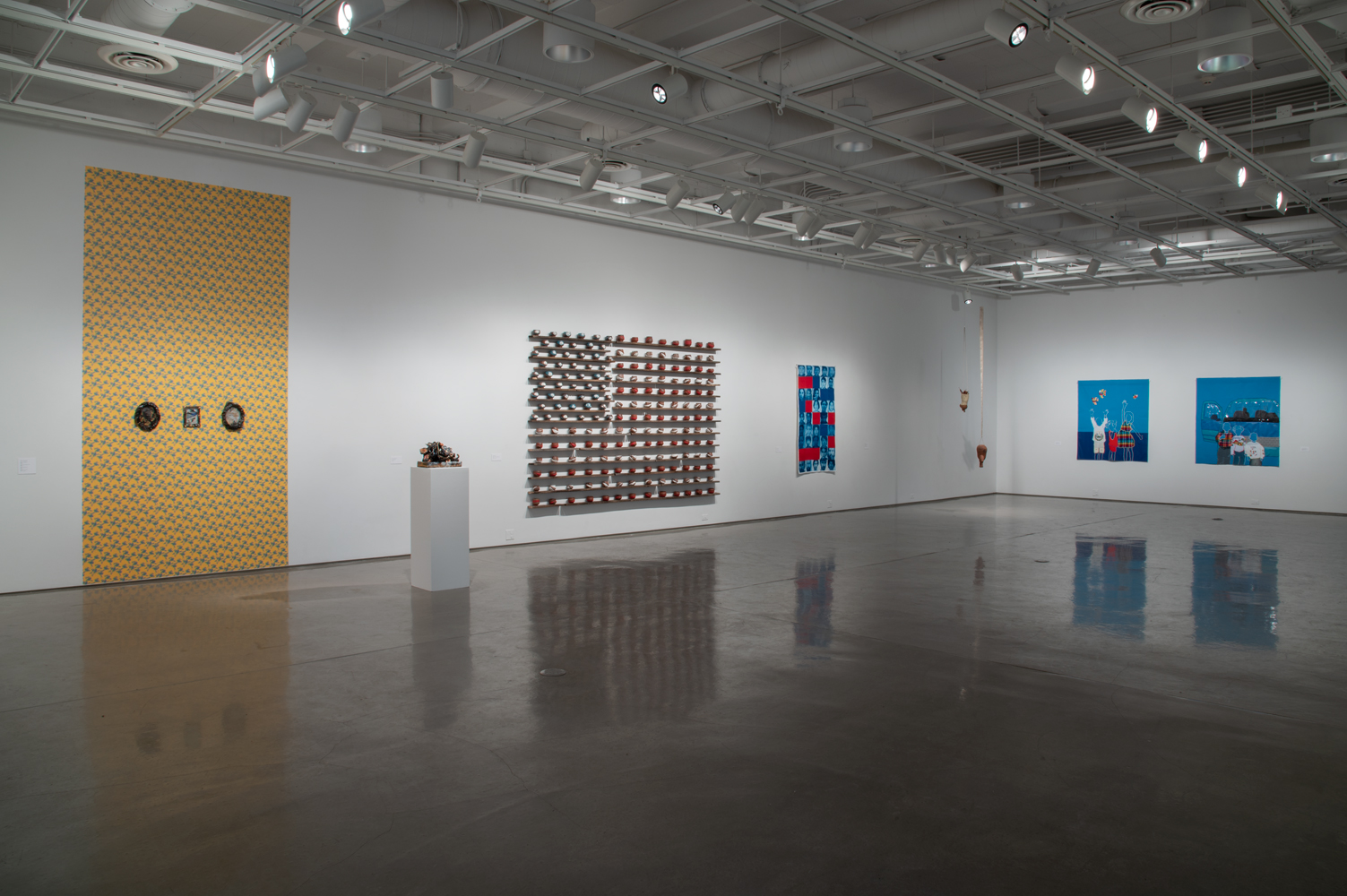 Click to view display of various art pieces on two walls in the gallery Full-Screen