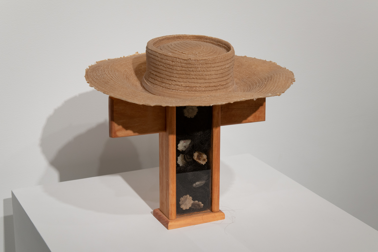 Click to view art piece using various materials sitting on a platform by Jada Patterson Full-Screen