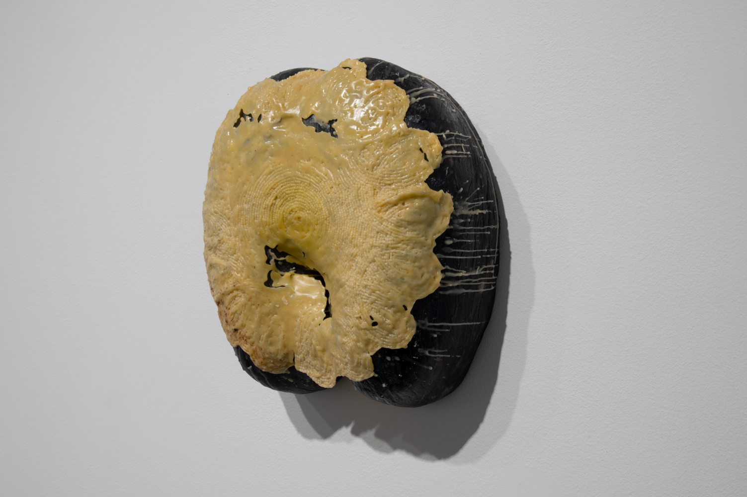 Click to view black and yellow sculpture by Jada Patterson hanging on the wall Full-Screen