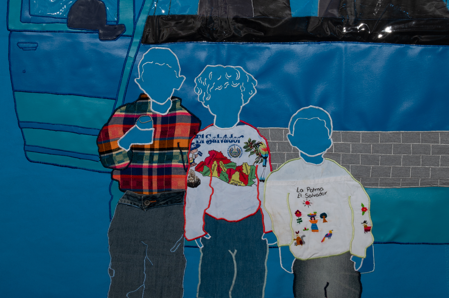 Click to view art piece of children standing in front of a vehicle using materials of repurposed family clothes by Arleene Correa Valencia Full-Screen