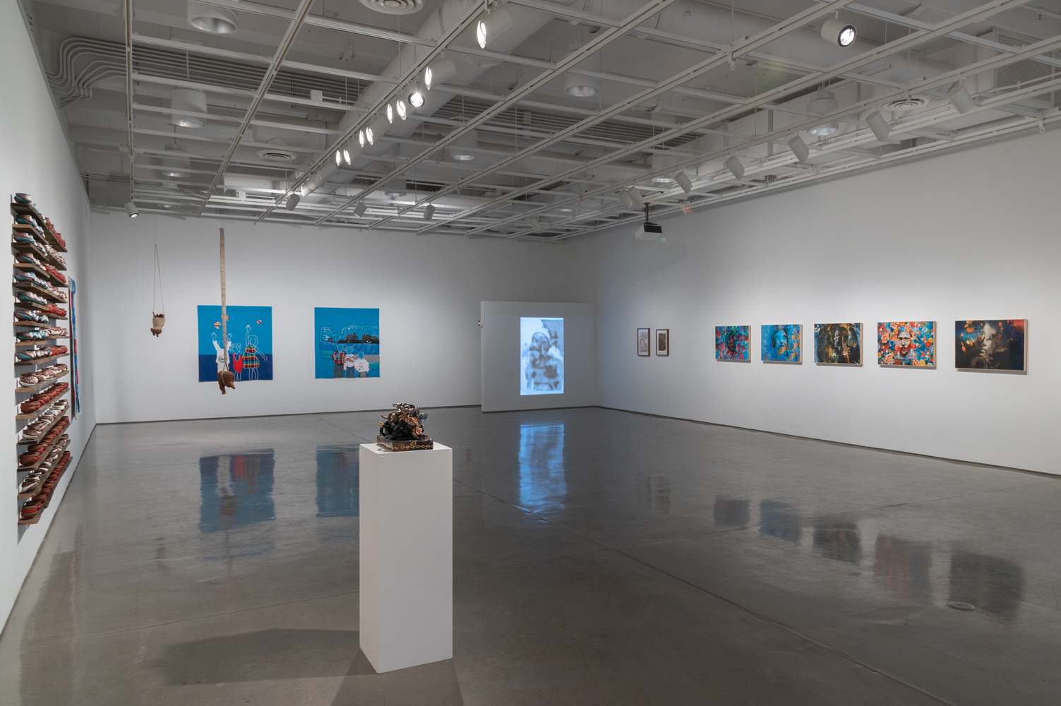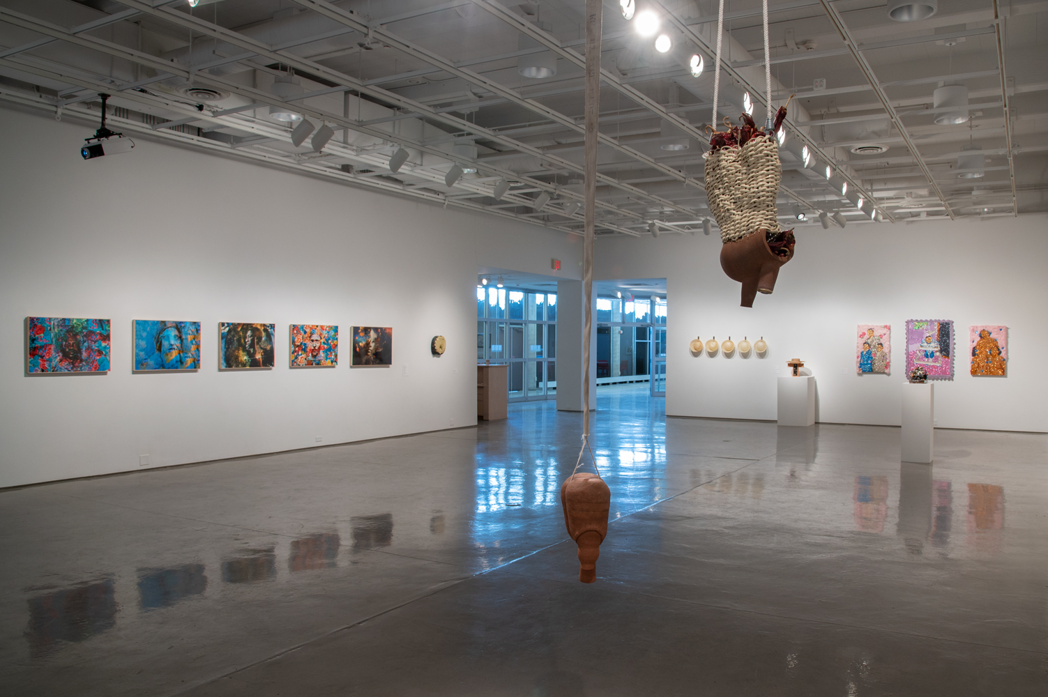Click to view art gallery showcasing various sculptures and paintings both suspended from the ceiling, on platforms, and hanging on the wall Full-Screen