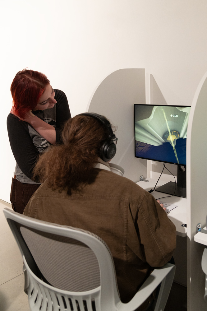 Click to view person sitting at computer with headphones on and someone standing instructing them Full-Screen